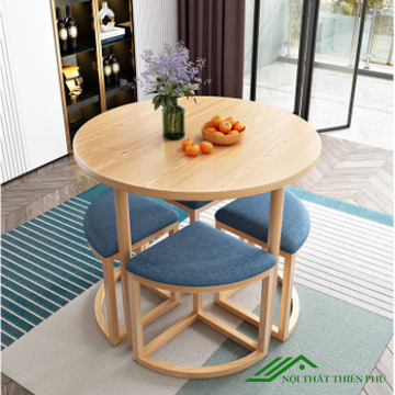 Bàn có mặt bàn tròn gọn gàng kết hợp với 4 chiếc ghế có thiết kế độc, xếp thành vừa hình tròn để gọn gàng dưới gầm bàn tiết kiệm diện tích. Màu sắc và chất liệu đa dạng tuỳn vào nhu cầu và sở thích của khách hàng.