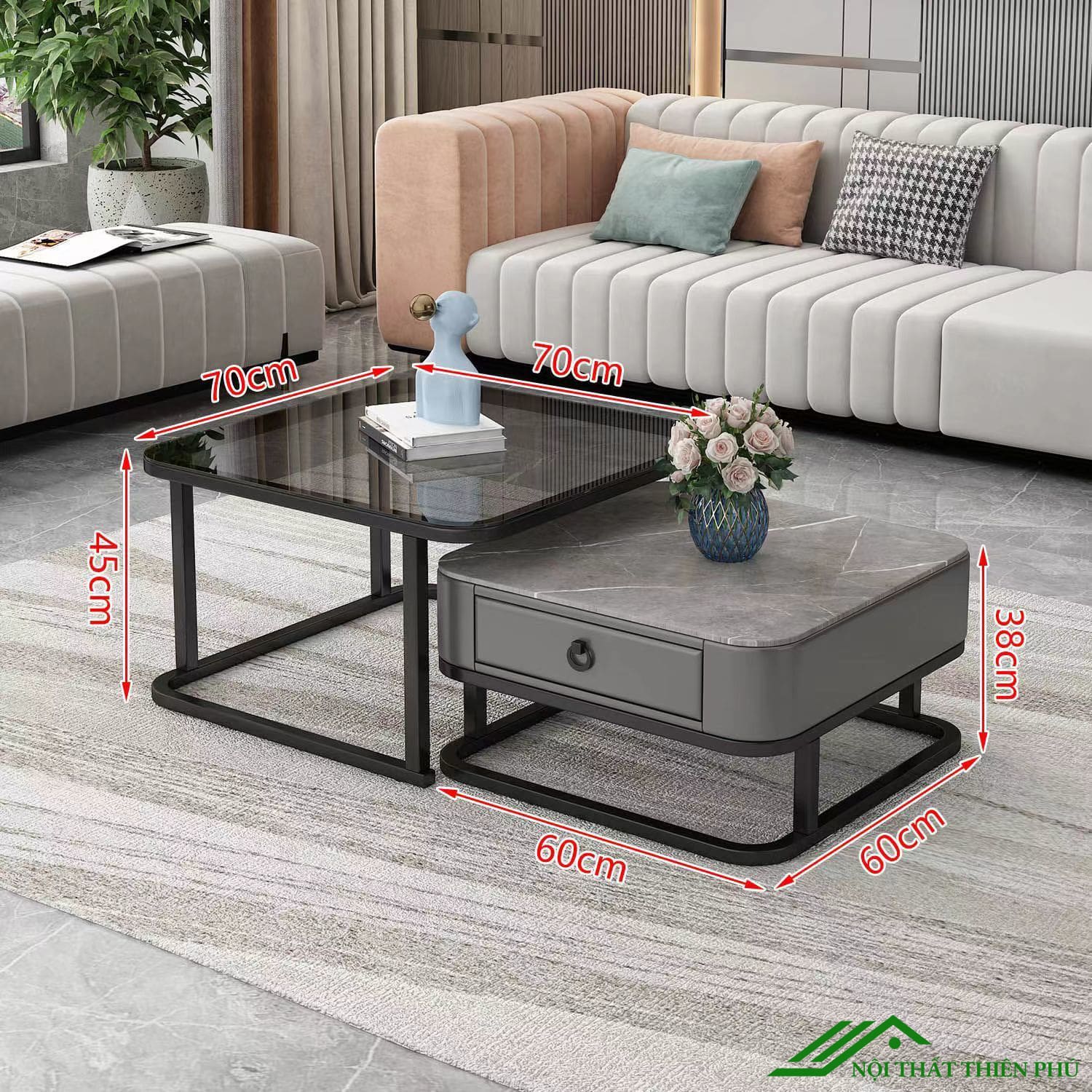 - Kích thước: Bàn mặt kính: Dài 70cm x Rộng 70cm x Chiều cao 45cm/ Bàn mặt đá lồng bên dưới: Dài 60cm x Rộng 60cm x Cao 38cm