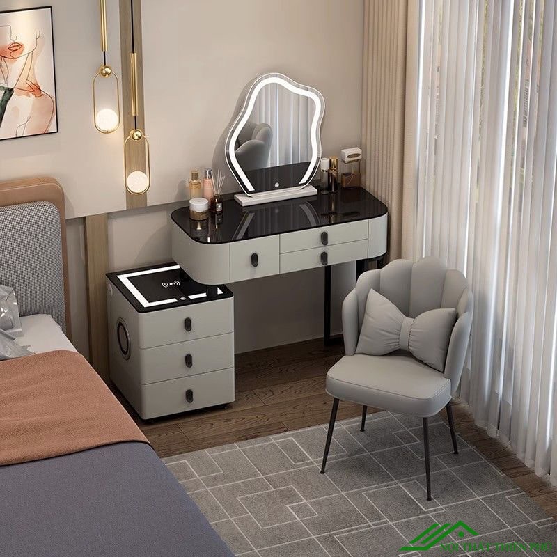 - Kết cấu: Bàn trang điểm gồm bàn phấn, gương, tủ tab, chân bàn và dụng cụ lắp ráp đi kèm.