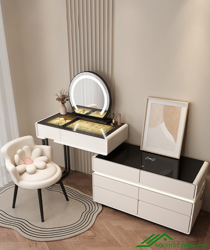 Điểm đặc biệt nổi bật của bàn trang điểm TD 36 chính là các công nghệ hiện đại được tích hợp, mang lại trải nghiệm tiện ích vượt trội. Công nghệ sạc không dây giúp bạn dễ dàng sạc các thiết bị di động mà không cần đến dây cáp rườm rà. Đèn Led cảm biến không chỉ mang lại ánh sáng đủ và đều, giúp bạn trang điểm chính xác và chi tiết hơn, mà còn tiết kiệm năng lượng và dễ dàng điều chỉnh độ sáng phù hợp với từng nhu cầu sử dụng.