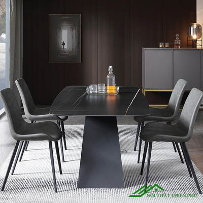 Bộ Bàn Ăn Mặt Đá Hiện Đại Chân Chữ V là dòng bàn ăn mặt đá sang trọng. Thiết kế mang phong cách hiện đại kết hợp giữa Bàn ăn mặt đá và ghế cao cấp. Khung bàn được làm từ thép mạ mạ đen có độ bền cao, không bị bong hoen rỉ, mang lại sự huyền bí.