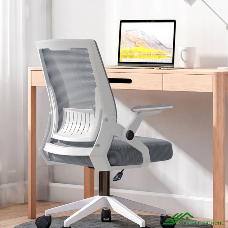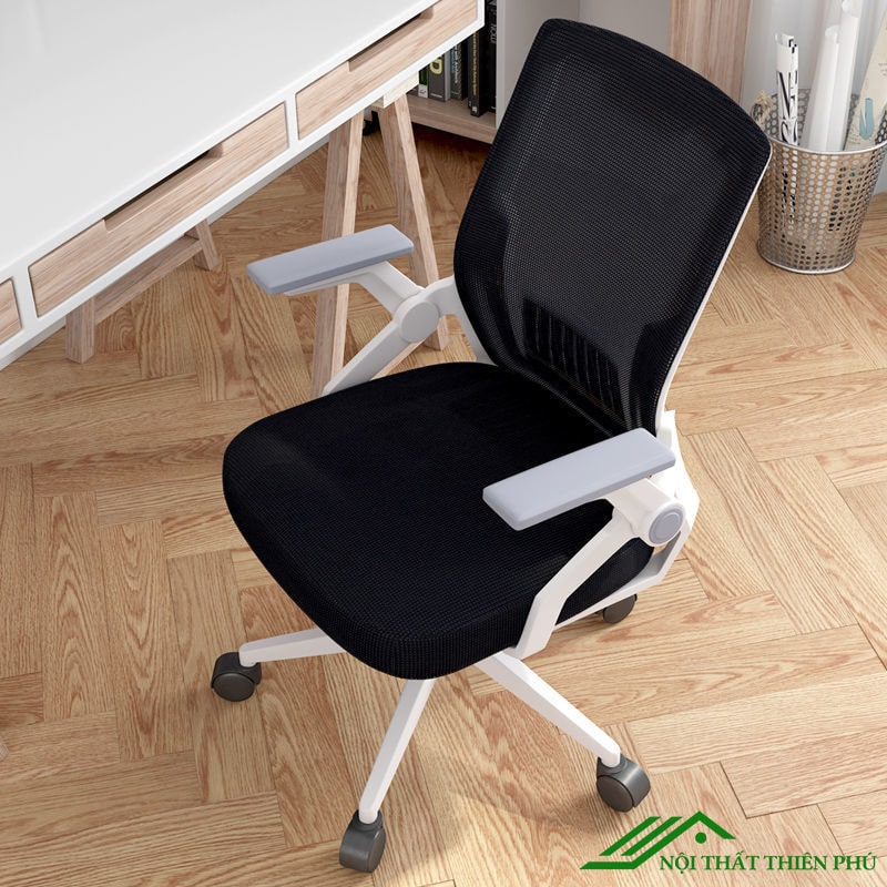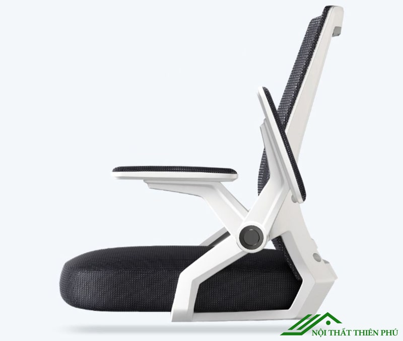 - Tay vịn có thể gập gọn, giúp tiết kiệm không gian khi không sử dụng hoặc khi cần đặt ghế sát bàn làm việc.