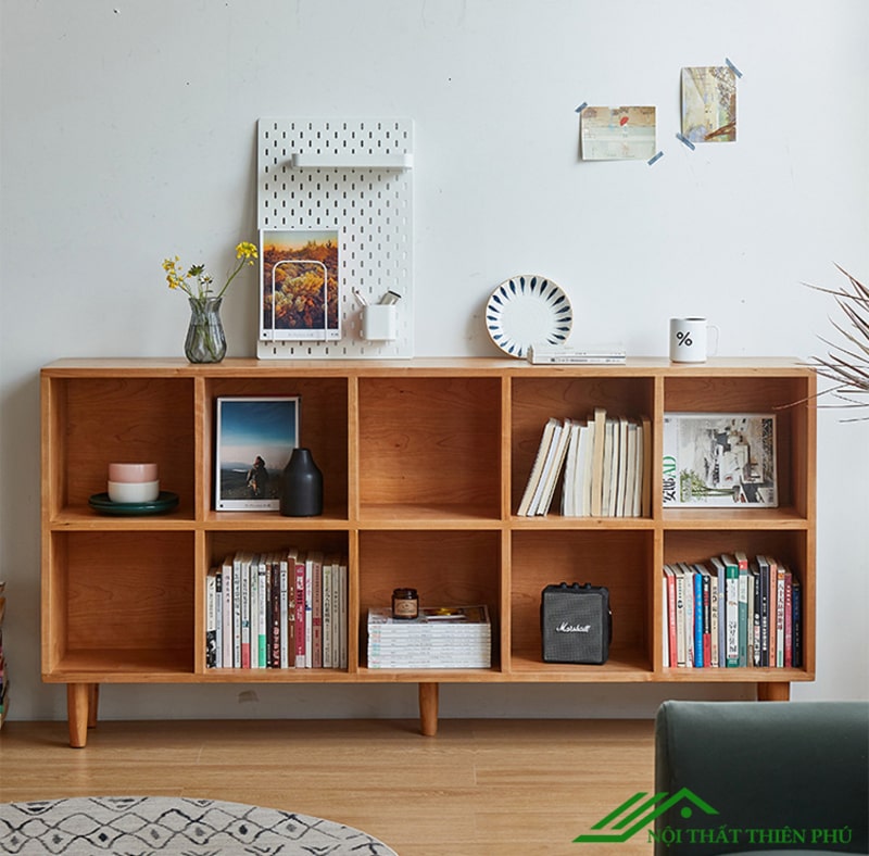Kệ có thiết kế dạng ô vuông với các ngăn có kích thước đồng đều, tạo không gian lưu trữ rộng rãi và gọn gàng. Đây là lựa chọn lý tưởng để sắp xếp sách, đồ trang trí, hoặc các vật dụng cá nhân. Sản phẩm còn được trang bị các chân gỗ vát nhẹ, không chỉ mang lại cảm giác thanh thoát mà còn giúp kệ chịu lực tốt và chống ẩm hiệu quả từ sàn nhà.