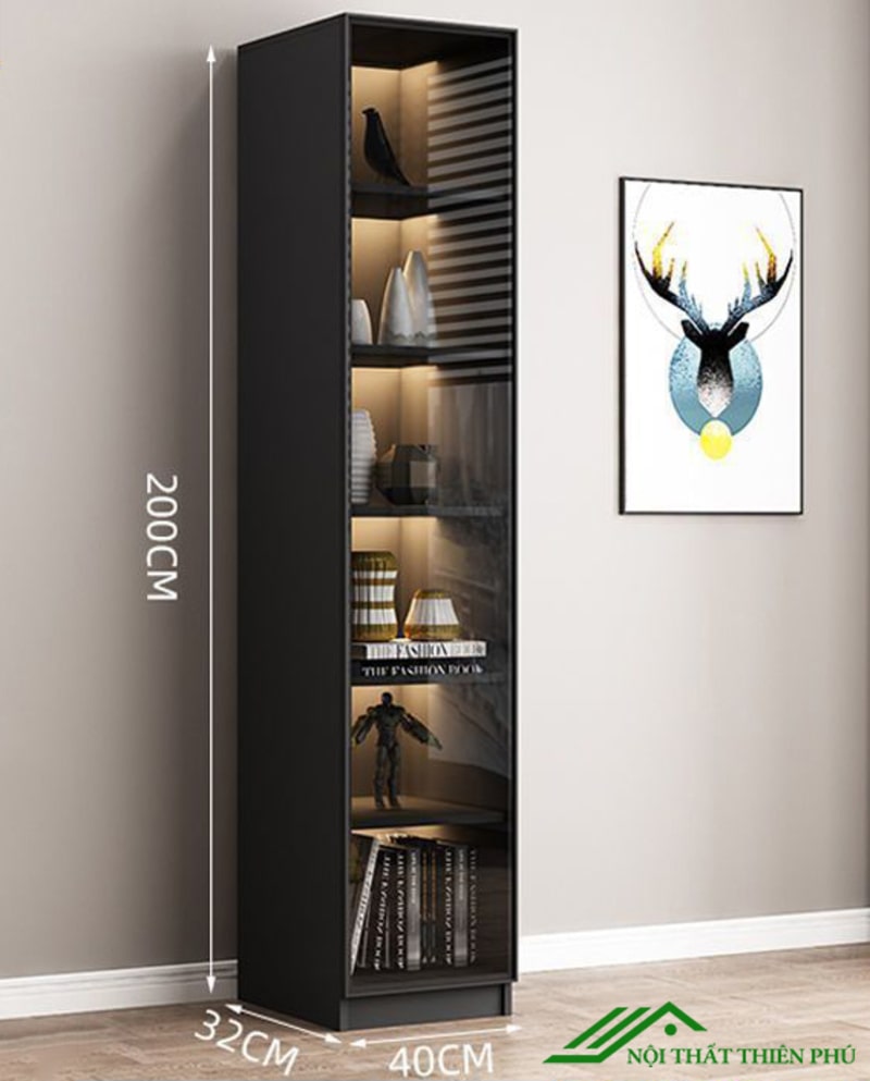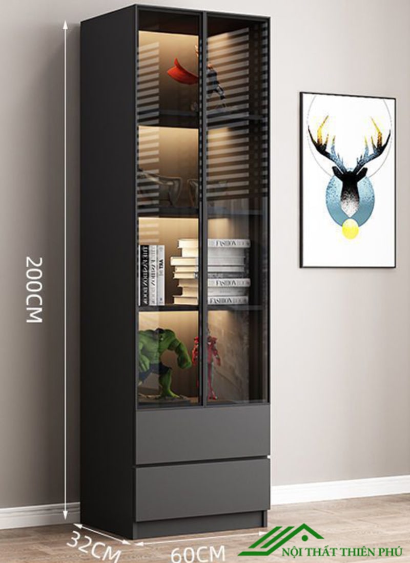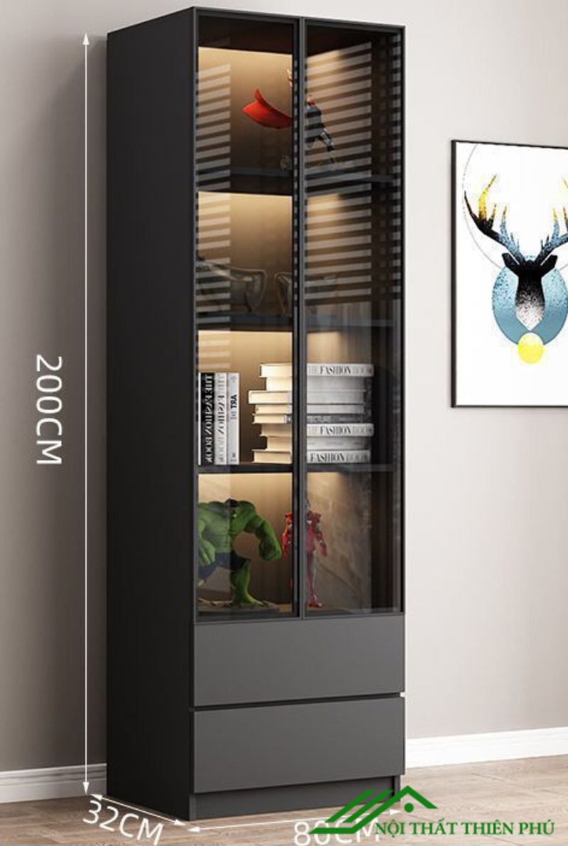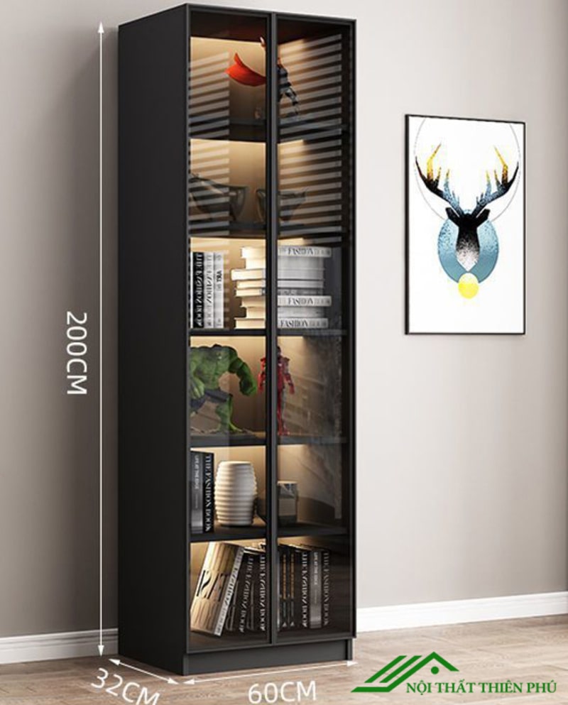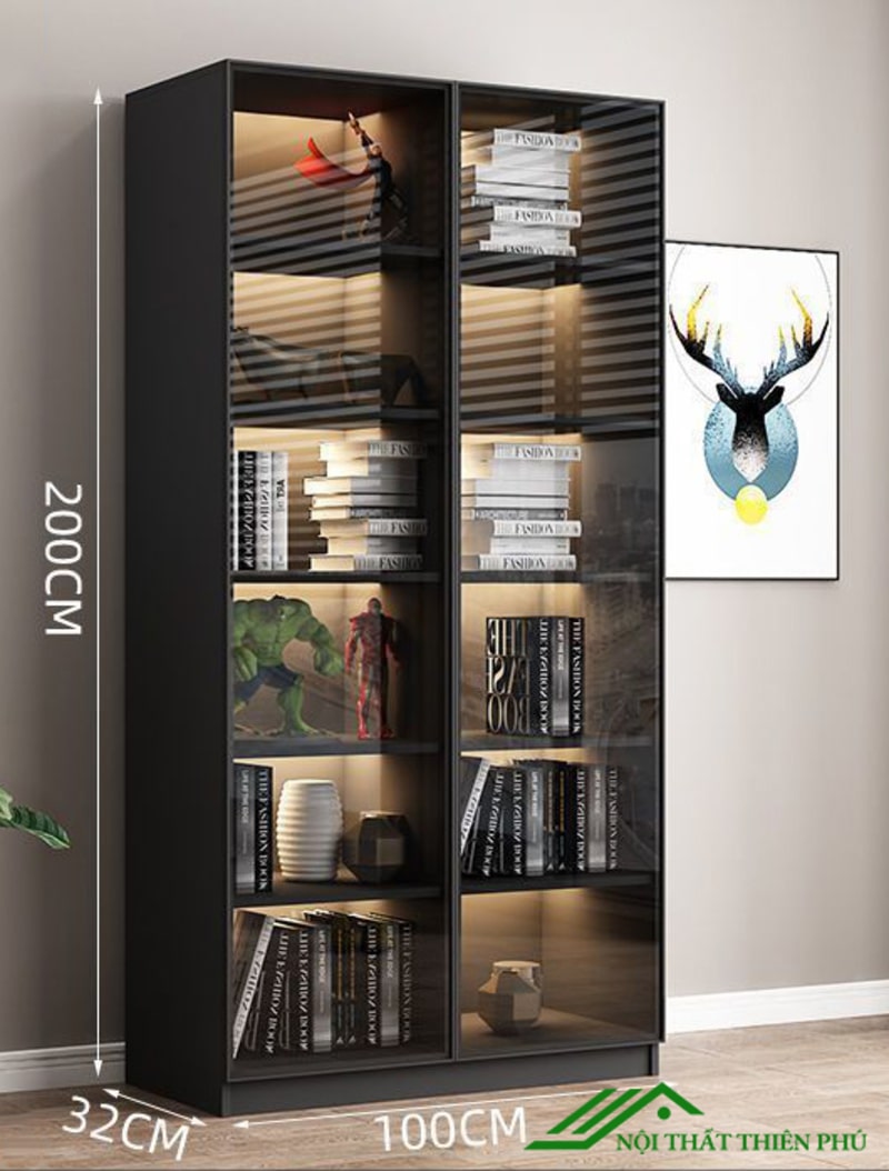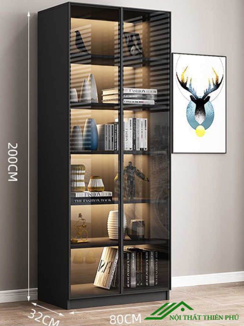 Sản phẩm có thiết kế dạng hình khối tối giản nhưng không kém phần sang trọng, với các ngăn kệ mở và kệ kín giúp tối ưu hóa không gian lưu trữ. Cửa kính trong suốt không chỉ bảo vệ sách và vật dụng khỏi bụi bẩn mà còn tạo hiệu ứng ánh sáng, làm nổi bật các món đồ trang trí bên trong. Hệ thống đèn LED âm tủ được tích hợp khéo léo, mang lại ánh sáng ấm áp, giúp sản phẩm trở thành điểm nhấn độc đáo cho phòng làm việc, phòng khách hay phòng đọc sách.