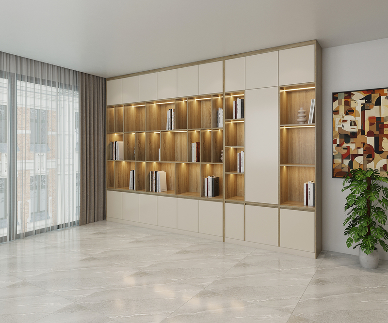 TT 13 được thiết kế theo dạng kệ âm tường, chạy dài theo mảng tường lớn, tạo cảm giác không gian được mở rộng và gọn gàng hơn. Các khoang kệ được chia đều, nhịp nhàng, giúp tổng thể không bị rối dù trưng bày nhiều sách và vật dụng trang trí. Sự kết hợp giữa kệ mở và tủ kín là điểm mạnh của mẫu thiết kế này. Kệ mở dành cho sách, đồ decor, vật phẩm trang trí; trong khi các khoang tủ kín phía dưới và phía trên giúp cất gọn những đồ dùng ít sử dụng, giữ cho không gian luôn ngăn nắp.