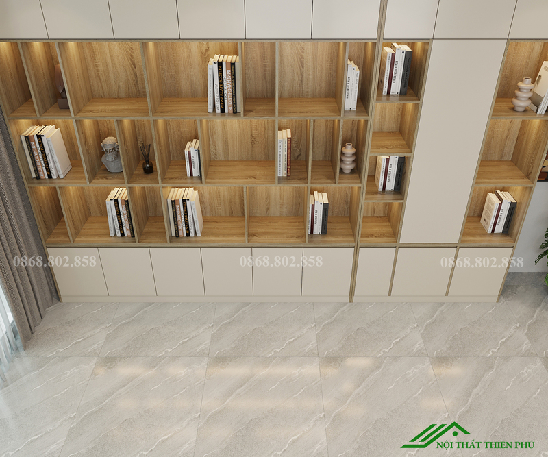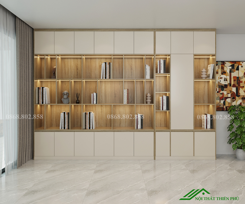 Toàn bộ kệ sách, tủ trang trí TT 13 được Nội thất Thiên Phú thiết kế và sản xuất trực tiếp tại xưởng. Điều này cho phép điều chỉnh kích thước, màu sắc và cách chia khoang sao cho phù hợp với diện tích và phong cách của từng công trình. Đội ngũ Thiên Phú không chỉ cung cấp sản phẩm, mà còn tư vấn cách bố trí kệ để phát huy tối đa giá trị thẩm mỹ và công năng trong không gian thực tế.