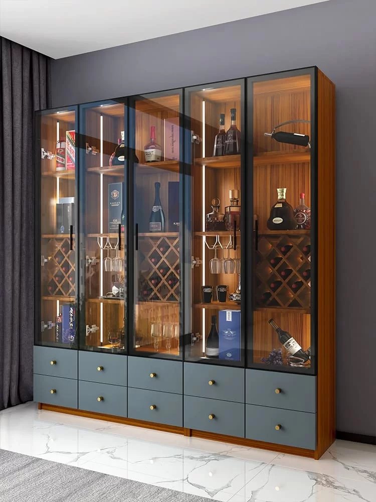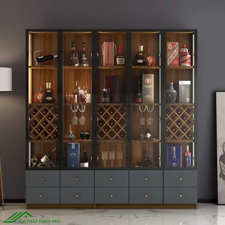 * Mô tả: Tủ có các ngăn kéo để đồ đi cùng cánh kính và các ô rượu tổ ong độc đáo .
