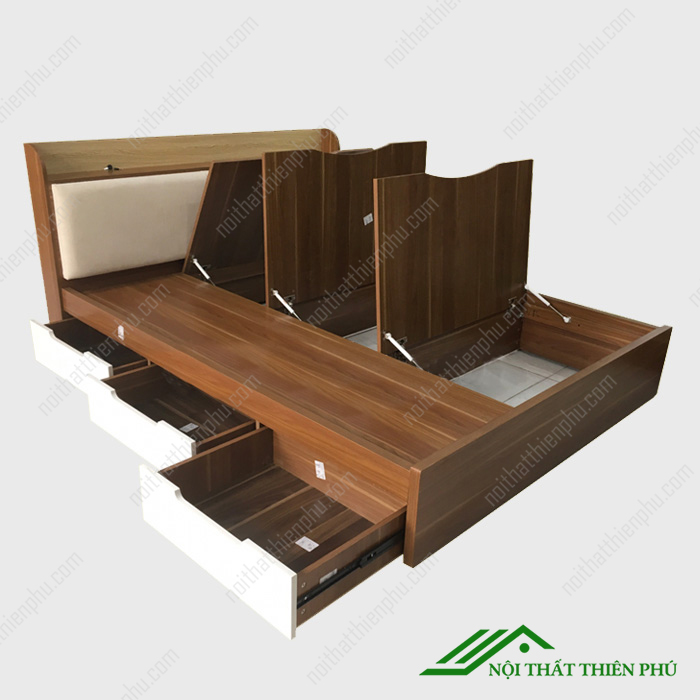 Mẫu giường ngủ thông minh với nhiều ngăn kéo, hộc bên dưới để đồ, chăn, ga,... giúp tiết kiệm diện tích, tận dụng tối đa không gian