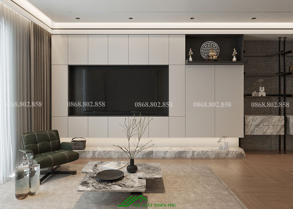 Tivi và kệ tivi: Một bức tường hoặc kệ TV được thiết kế để treo TV và lưu trữ các thiết bị đa phương tiện như đầu DVD, hệ thống âm thanh, và các vật dụng trang trí được thi công âm với tủ đứng tạo nên hiệu quả thẩm mỹ, đồng thời cũng là cách giúp tiết kiệm không gian nội thất.
