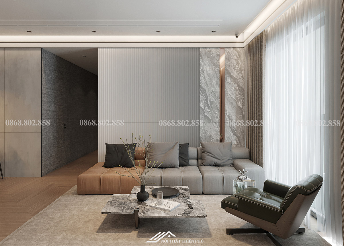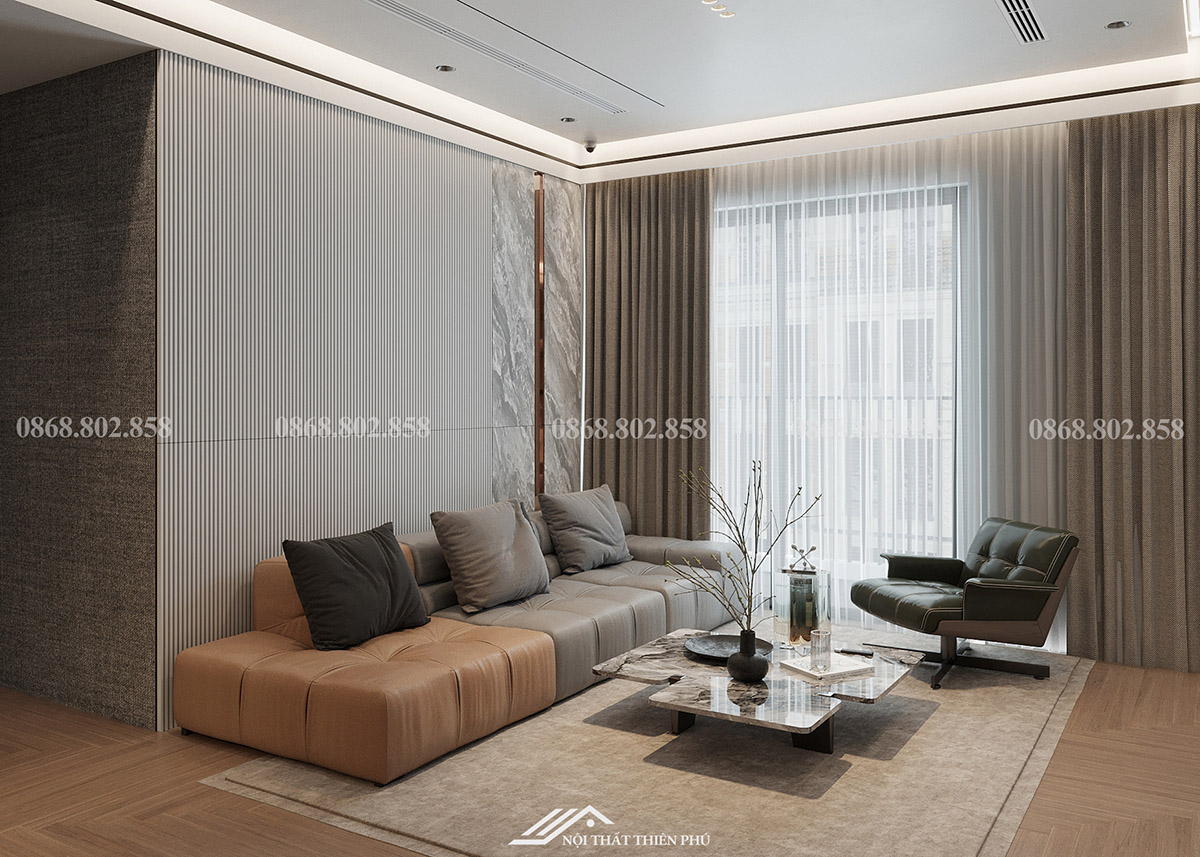 Sofa và Ghế: Phòng khách được trang bị bộ sofa thoải mái cùng với một hoặc hai chiếc ghế đơn, tạo nên không gian tiếp khách và nghỉ ngơi thoải mái. Bàn bằng đá với vân đá tự nhiên tạo nên hiệu quả thẩm mỹ vượt trội cho ngôi nhà.