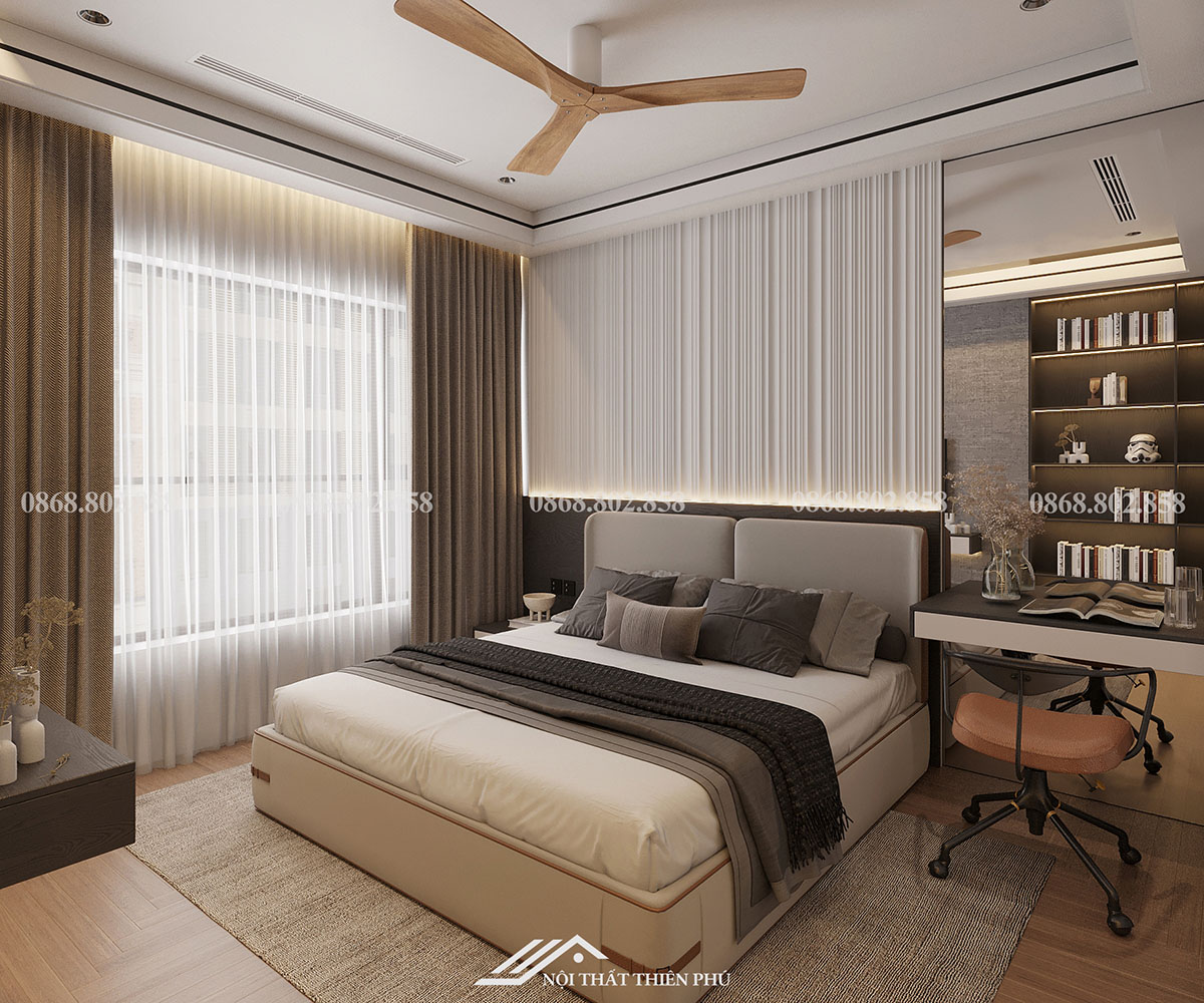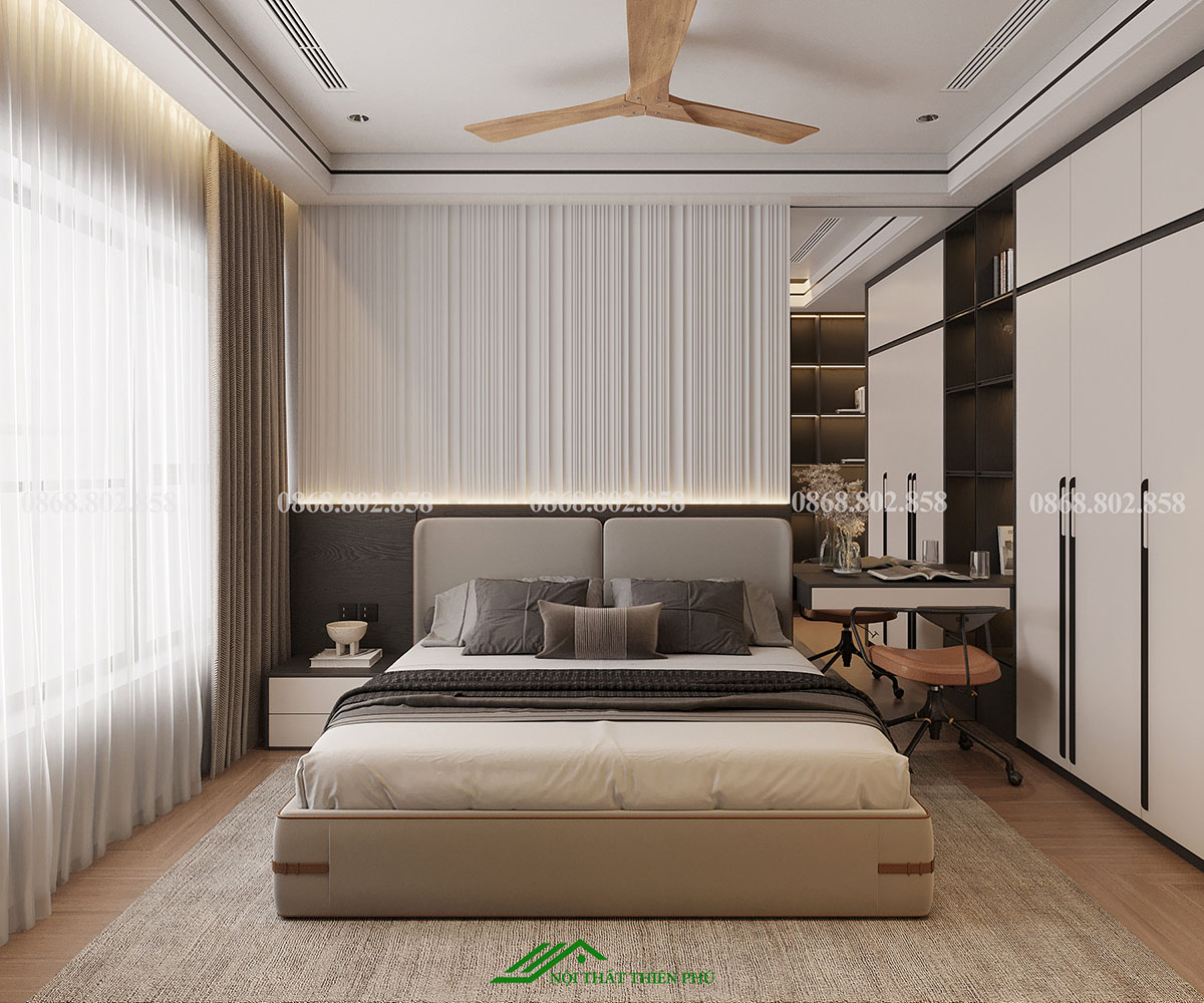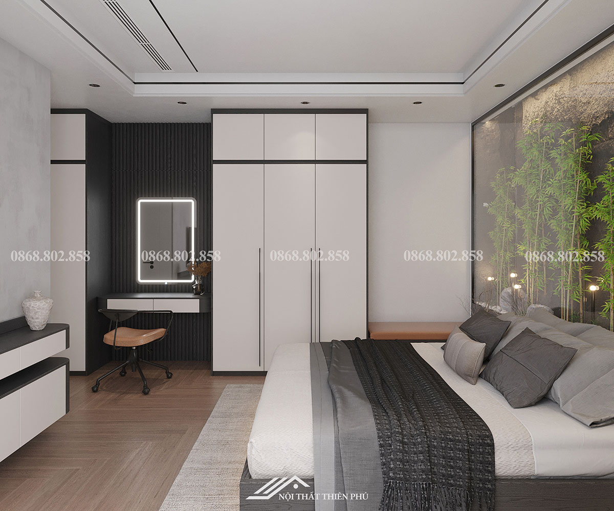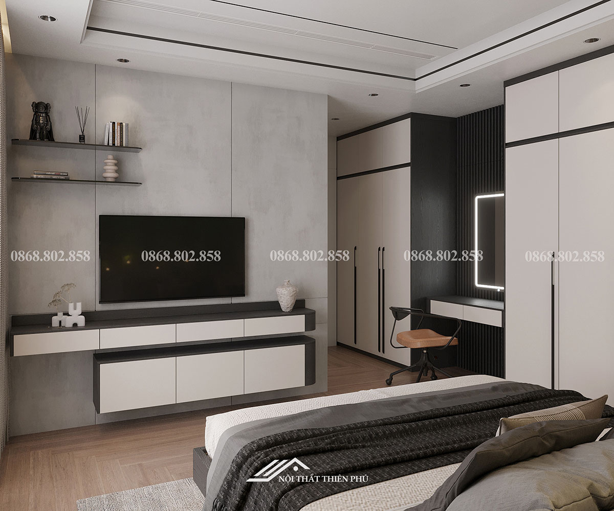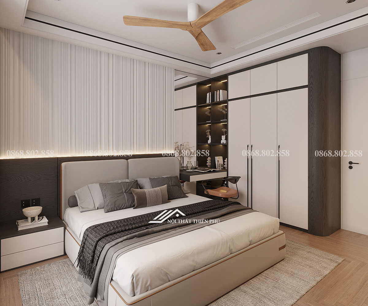 Tổng thể, không gian nội thất phòng ngủ của căn hộ dự án The Matrix One được thiết kế nhằm mang đến sự hài hòa giữa tính thẩm mỹ và công năng sử dụng, tạo nên một nơi nghỉ ngơi lý tưởng, hiện đại và sang trọng. Toàn bộ không gian nội thất của phòng ngủ dự án được thực hiện bởi nội thất Thiên Phú. Quý khách hàng có thể liên hệ trực tiếp với chúng tôi để được tư vấn và hướng dẫn tốt nhất.