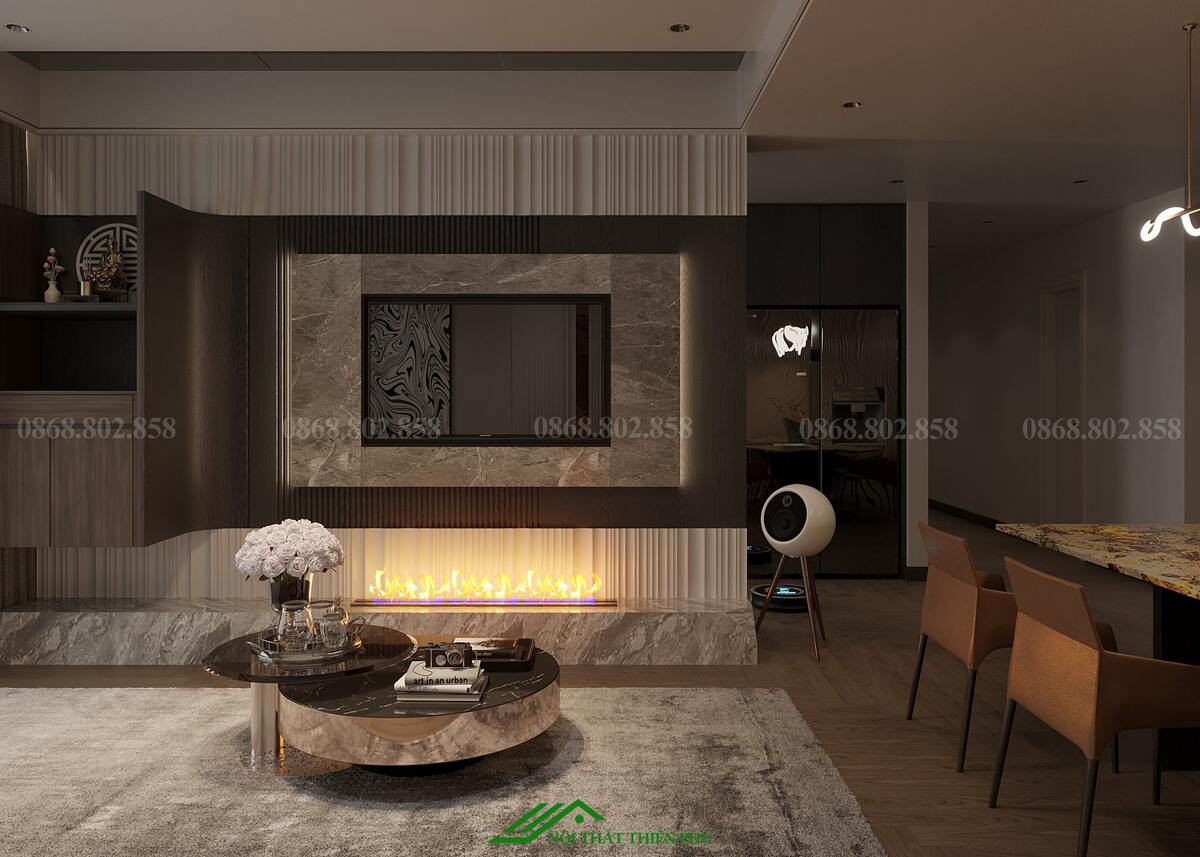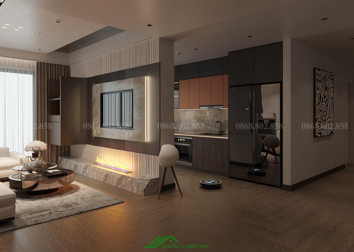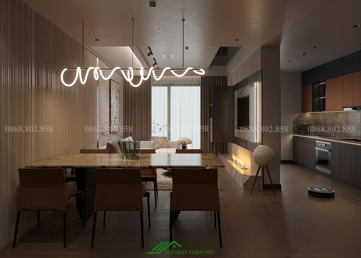 Thiết kế nội thất phòng khách và bếp của căn hộ mang phong cách hiện đại, tối ưu hóa không gian với sự kết hợp hài hòa giữa thẩm mỹ và công năng. Phòng khách và bếp được bố trí liền kề, tạo không gian mở, thoáng đãng và thuận tiện cho sinh hoạt gia đình. Sự lựa chọn vật liệu cao cấp như sàn gỗ màu tối kết hợp với nội thất tông nâu và đen mang lại cảm giác ấm cúng, sang trọng. Điểm nhấn ấn tượng là đèn trần thiết kế độc đáo và lò sưởi giả, không chỉ tăng tính thẩm mỹ mà còn tạo sự ấm áp cho căn hộ. Bàn ăn đá tự nhiên với họa tiết tinh tế góp phần làm nổi bật sự đẳng cấp của không gian. Khu vực bếp được trang bị đầy đủ thiết bị hiện đại, bố trí hợp lý, đảm bảo sự tiện nghi và thoải mái khi sử dụng. Ánh sáng tự nhiên từ cửa kính lớn kết hợp với ánh sáng vàng từ hệ thống đèn chiếu sáng giúp không gian trở nên hài hòa và dễ chịu. Tổng thể, thiết kế này không chỉ đáp ứng nhu cầu sinh hoạt mà còn nâng cao trải nghiệm sống, tạo nên không gian sống lý tưởng cho gia đình.
