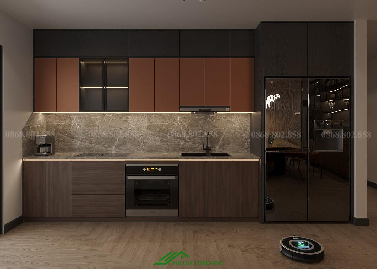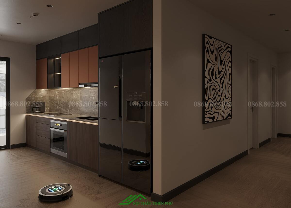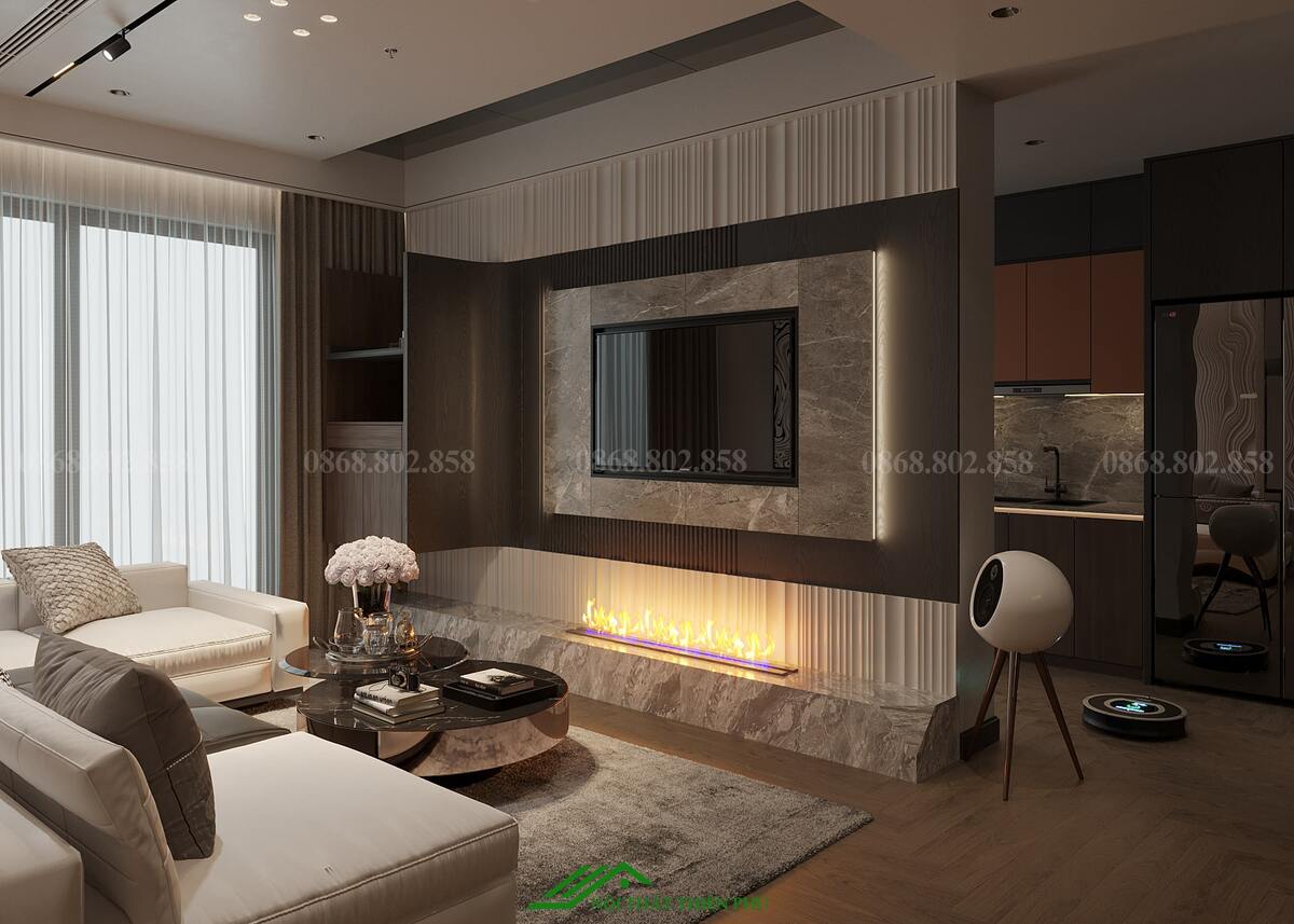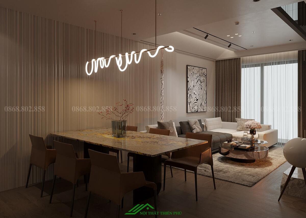 Thiết kế nội thất phòng khách và bếp của căn hộ mang phong cách hiện đại, tối ưu hóa không gian với sự kết hợp hài hòa giữa thẩm mỹ và công năng. Phòng khách và bếp được bố trí liền kề, tạo không gian mở, thoáng đãng và thuận tiện cho sinh hoạt gia đình. Sự lựa chọn vật liệu cao cấp như sàn gỗ màu tối kết hợp với nội thất tông nâu và đen mang lại cảm giác ấm cúng, sang trọng. Điểm nhấn ấn tượng là đèn trần thiết kế độc đáo và lò sưởi giả, không chỉ tăng tính thẩm mỹ mà còn tạo sự ấm áp cho căn hộ. Bàn ăn đá tự nhiên với họa tiết tinh tế góp phần làm nổi bật sự đẳng cấp của không gian. Khu vực bếp được trang bị đầy đủ thiết bị hiện đại, bố trí hợp lý, đảm bảo sự tiện nghi và thoải mái khi sử dụng. Ánh sáng tự nhiên từ cửa kính lớn kết hợp với ánh sáng vàng từ hệ thống đèn chiếu sáng giúp không gian trở nên hài hòa và dễ chịu. Tổng thể, thiết kế này không chỉ đáp ứng nhu cầu sinh hoạt mà còn nâng cao trải nghiệm sống, tạo nên không gian sống lý tưởng cho gia đình.
