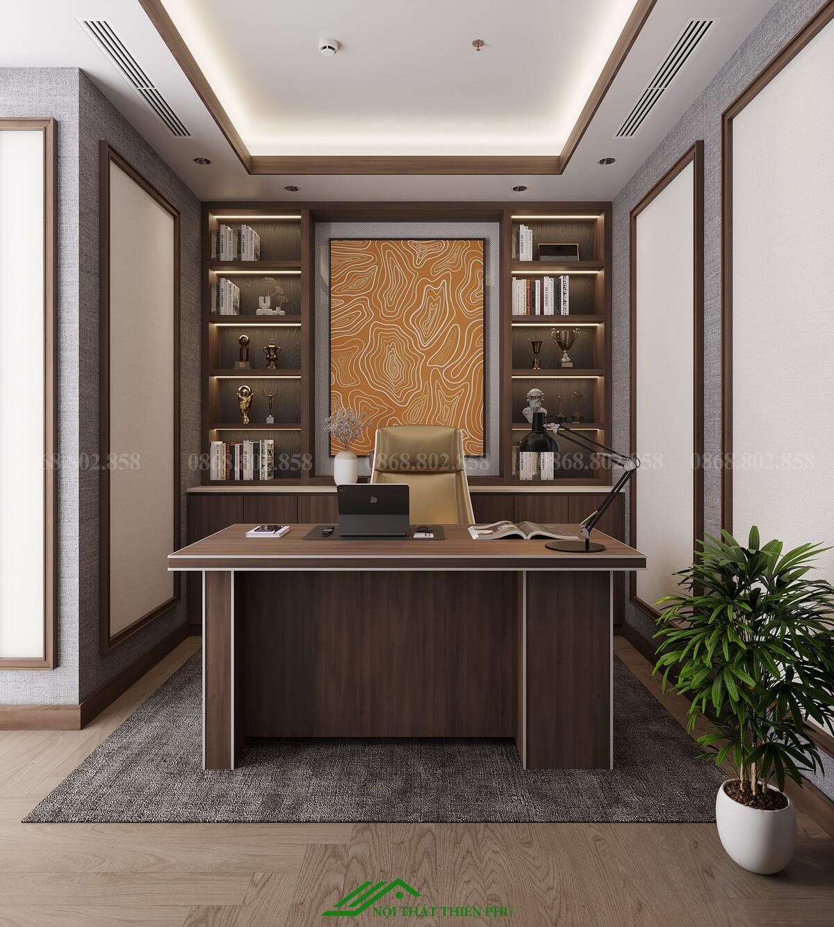 Không gian được thiết kế theo phong cách hiện đại, với tông màu trung tính, mang lại cảm giác nhẹ nhàng, thoải mái. Ánh sáng trong phòng được cân bằng giữa ánh sáng tự nhiên từ cửa sổ và ánh sáng nhân tạo từ hệ thống đèn, giúp giảm căng thẳng thị giác khi làm việc trong thời gian dài. Các chi tiết trang trí tinh tế như tranh treo tường hoặc cây xanh nhỏ không chỉ làm tăng tính thẩm mỹ mà còn tạo cảm hứng sáng tạo cho người sử dụng.