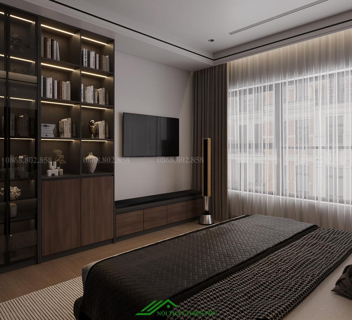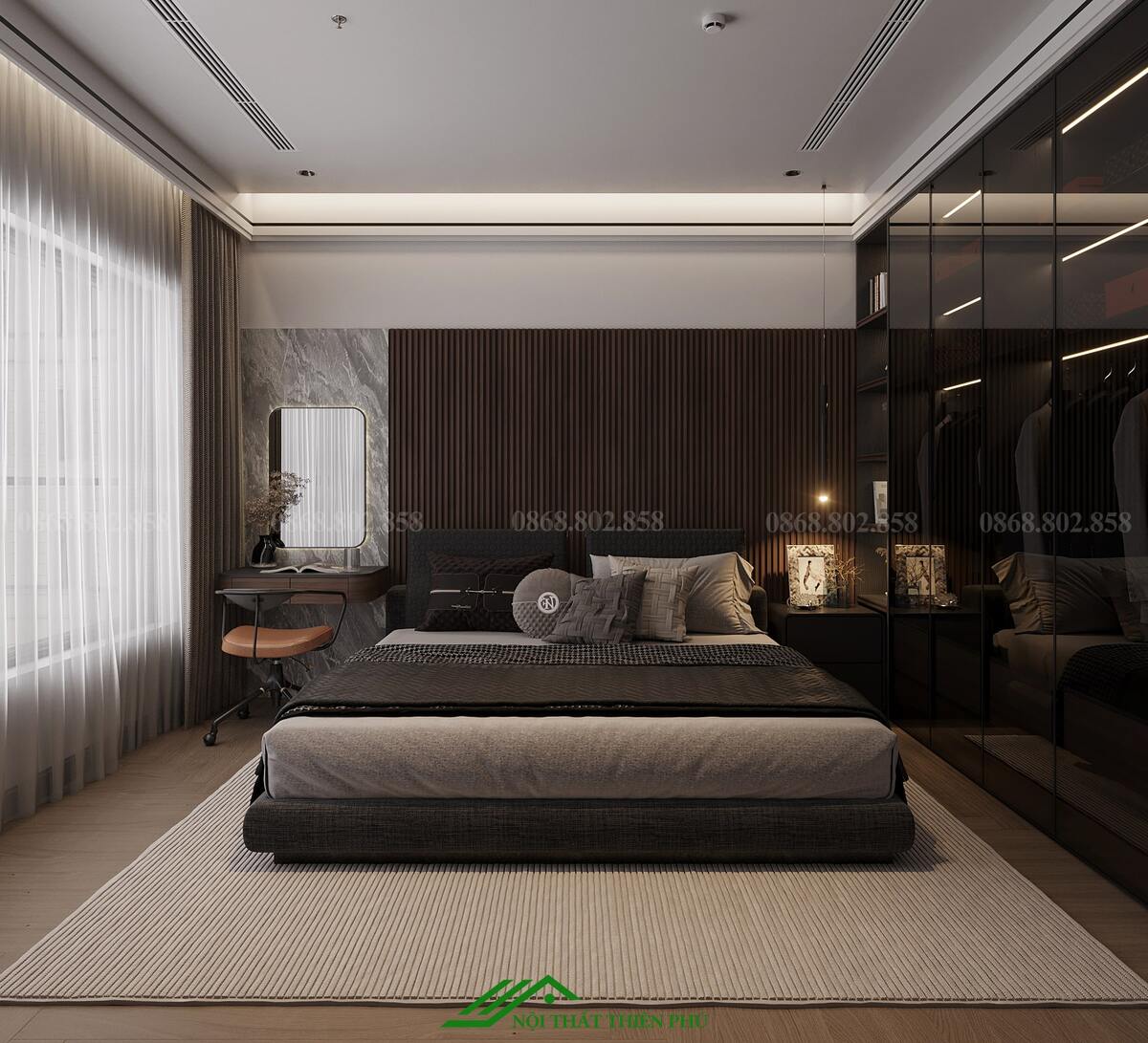 Hệ thống ánh sáng: Đèn trần và đèn thả đầu giường mang phong cách hiện đại, kết hợp với đèn LED âm trần, tạo nên không gian ánh sáng đa chiều, phù hợp cho cả nhu cầu nghỉ ngơi lẫn làm việc.