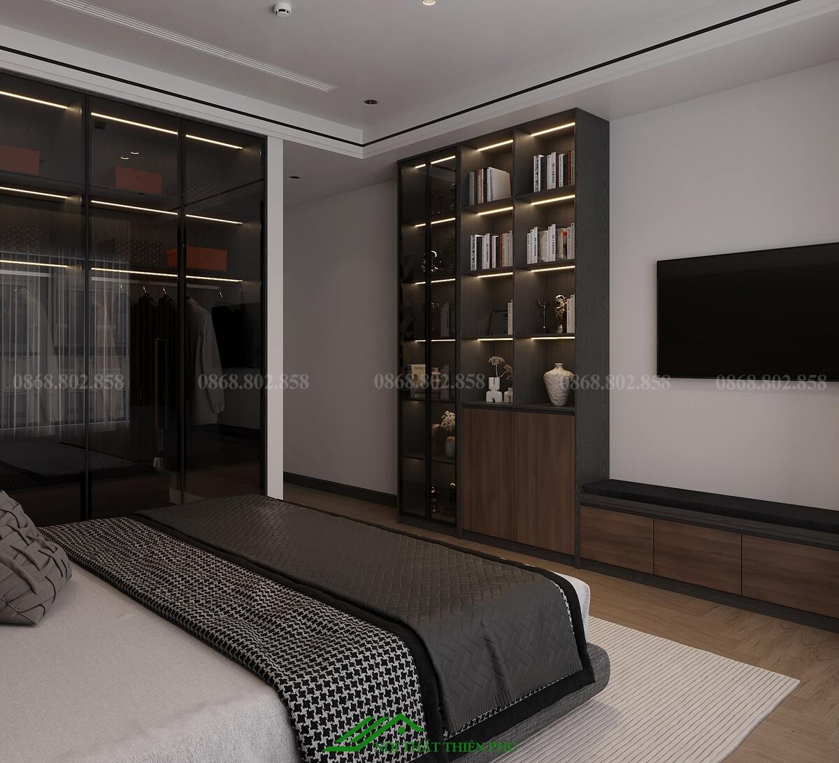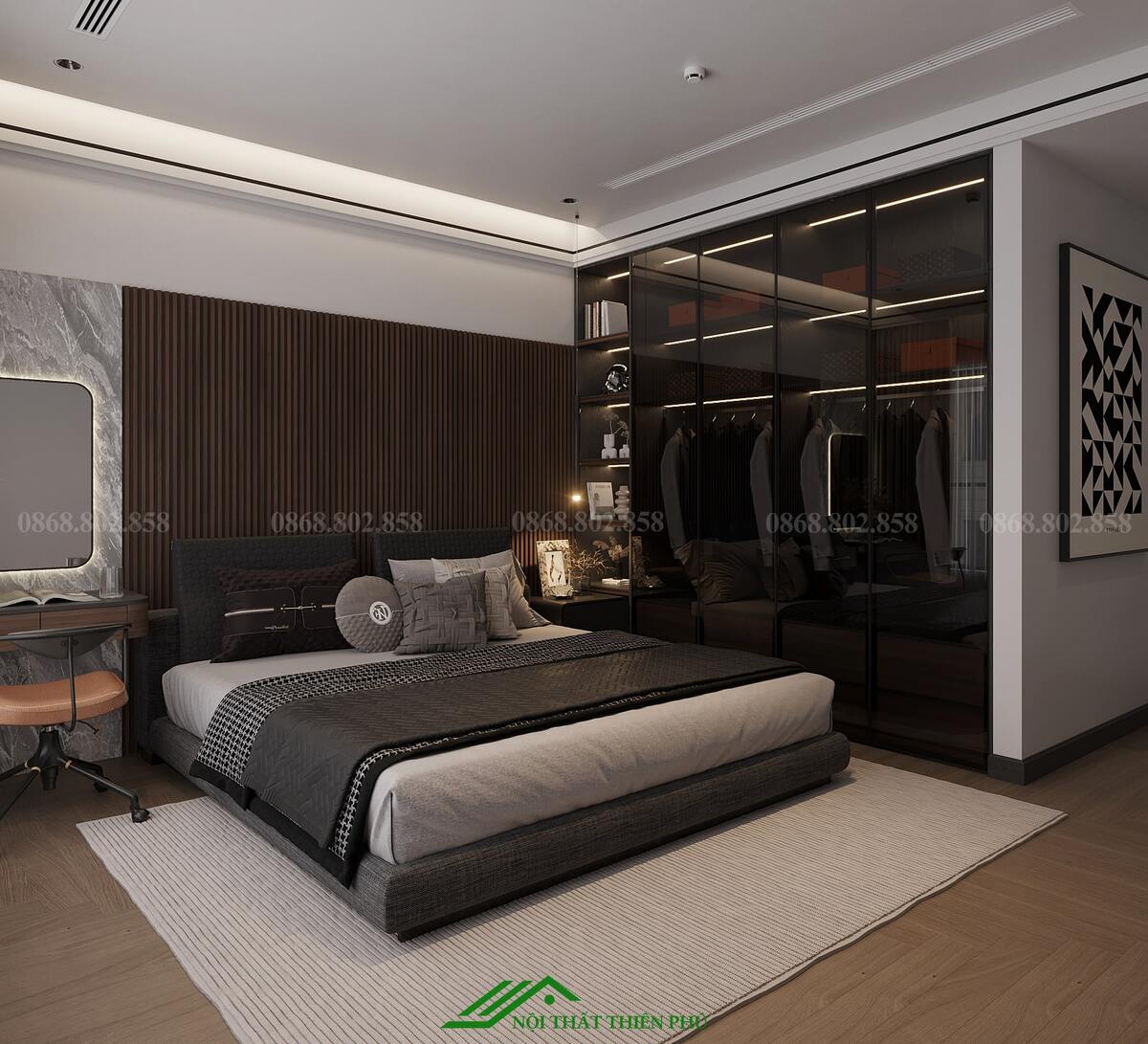 - Tủ quần áo: Tủ âm tường hoặc tủ đứng đa năng, đảm bảo không gian lưu trữ thoải mái mà không chiếm diện tích.