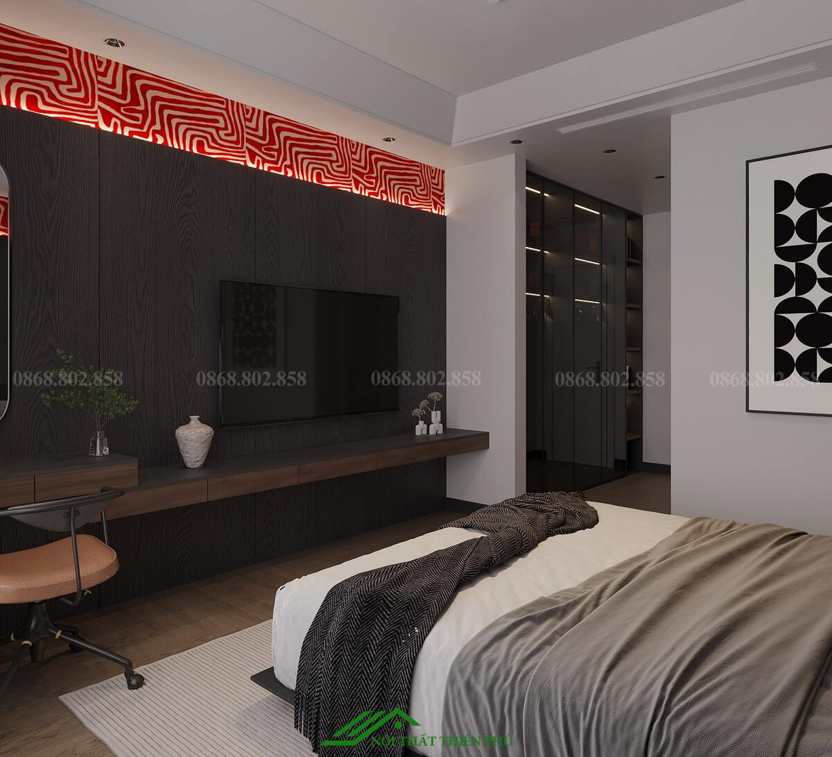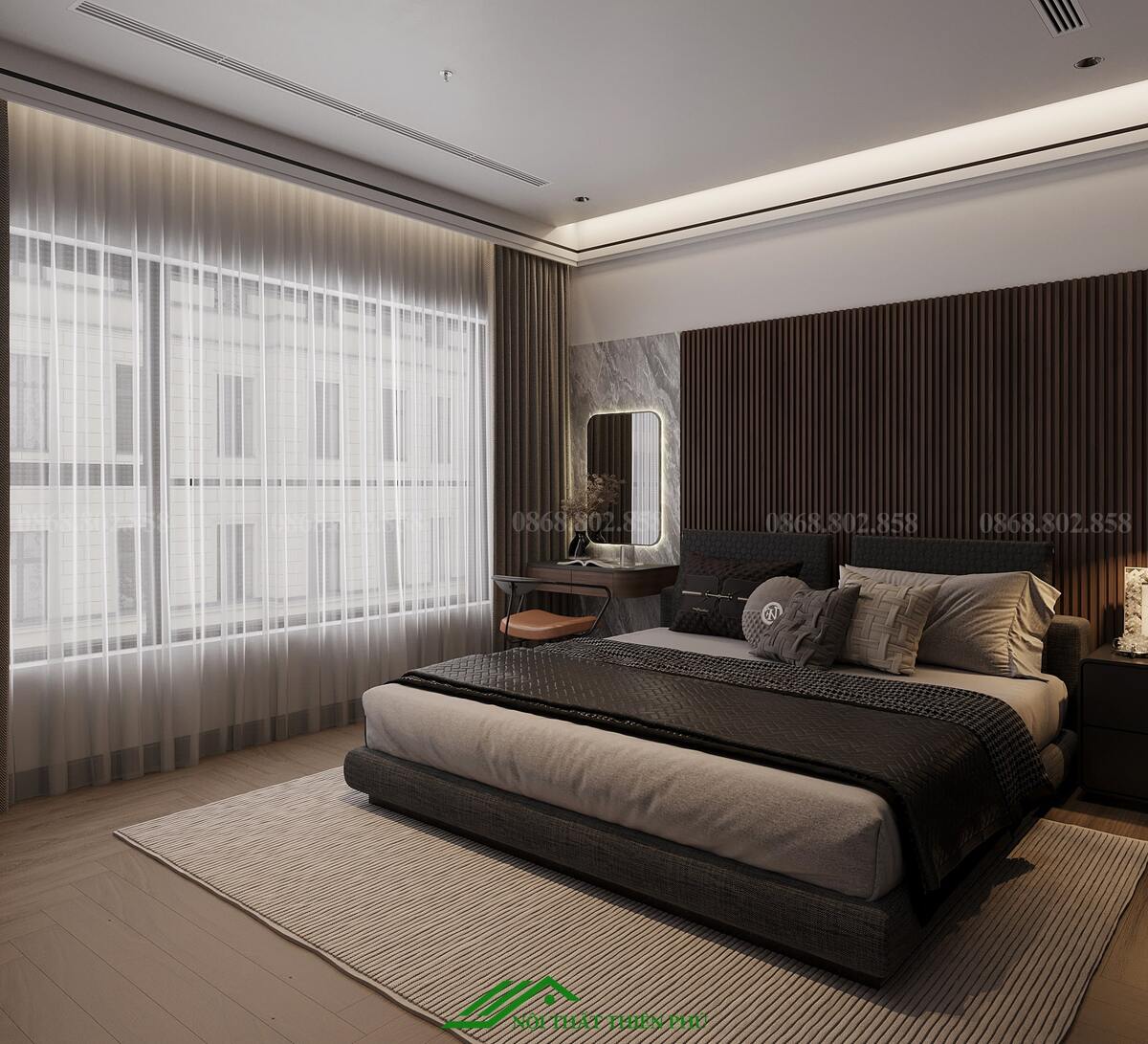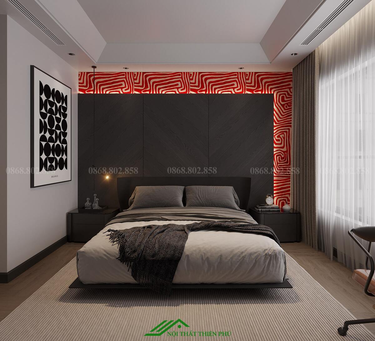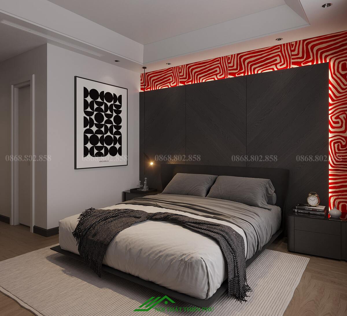 - Bố trí các chi tiết như gương, đồng hồ treo tường hoặc đèn ngủ với thiết kế hiện đại, tạo sự hài hòa tổng thể.