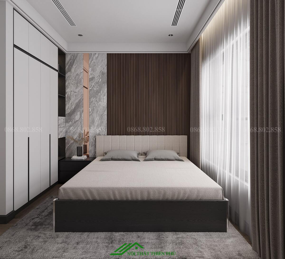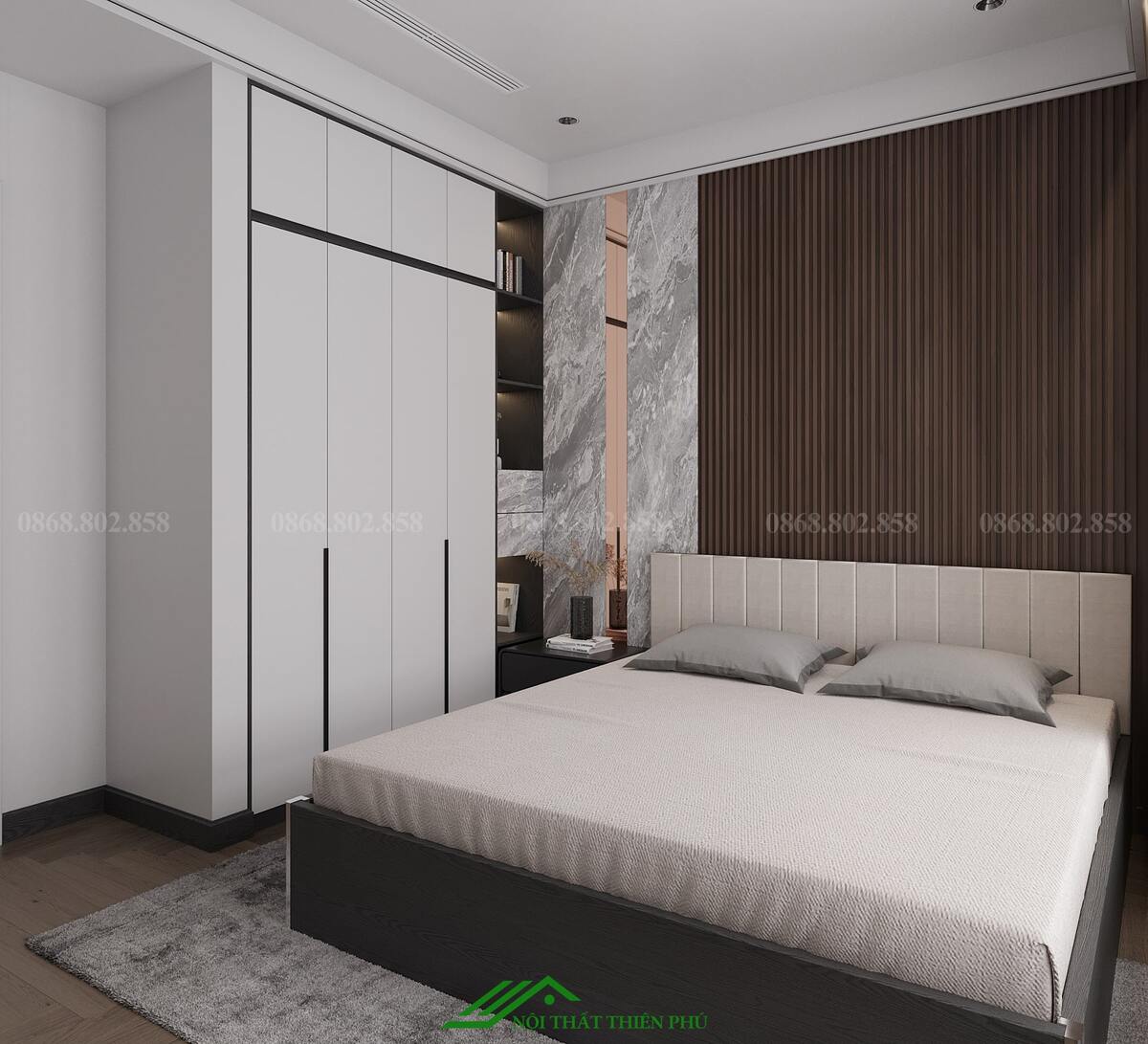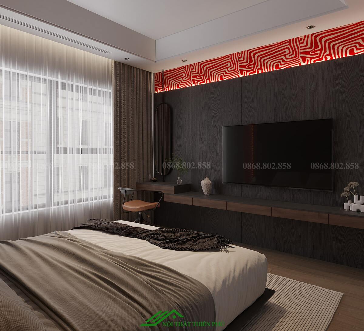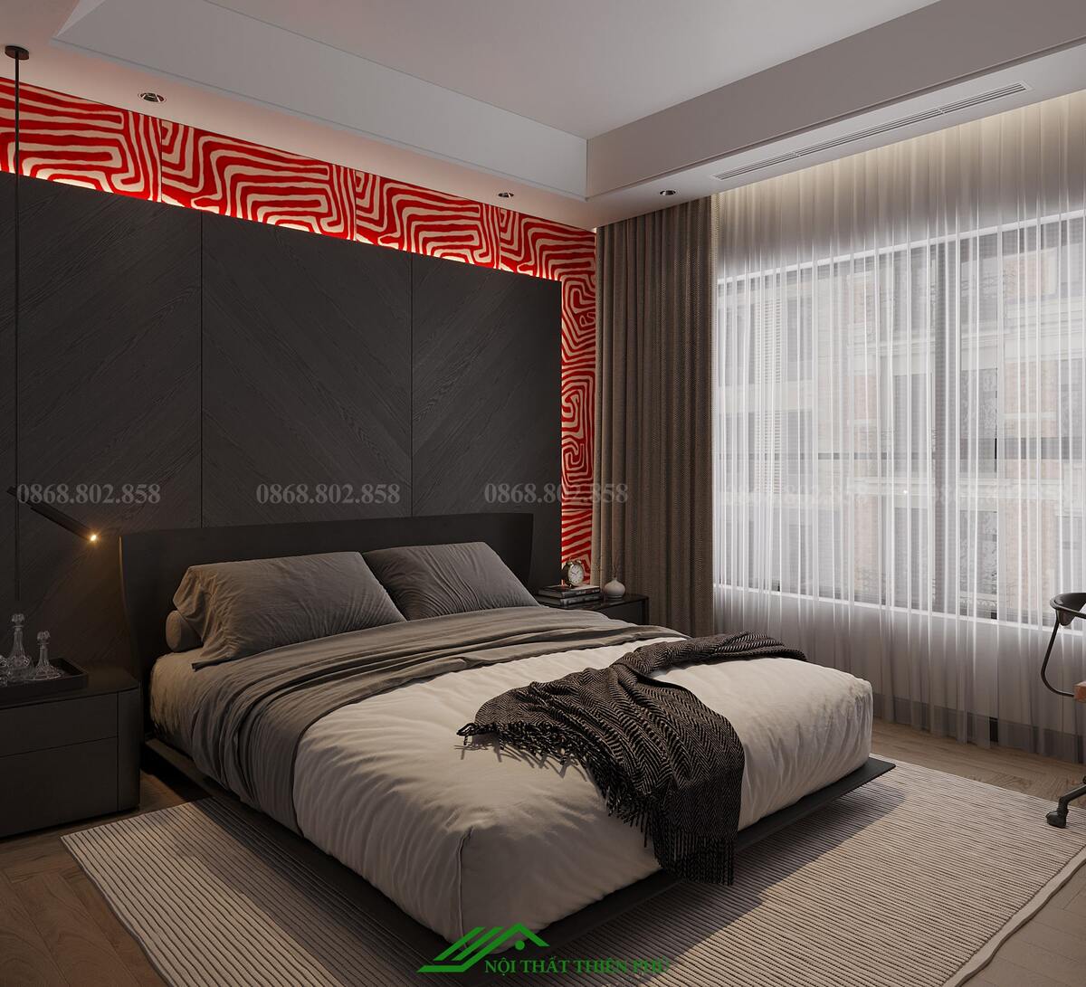 - Bố trí các chi tiết như gương, đồng hồ treo tường hoặc đèn ngủ với thiết kế hiện đại, tạo sự hài hòa tổng thể.
