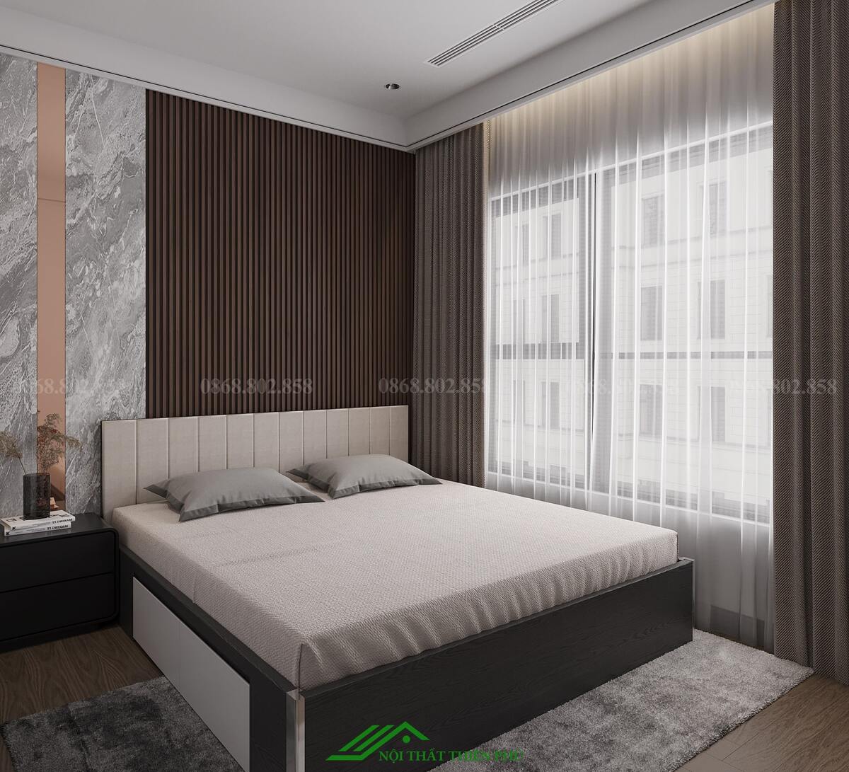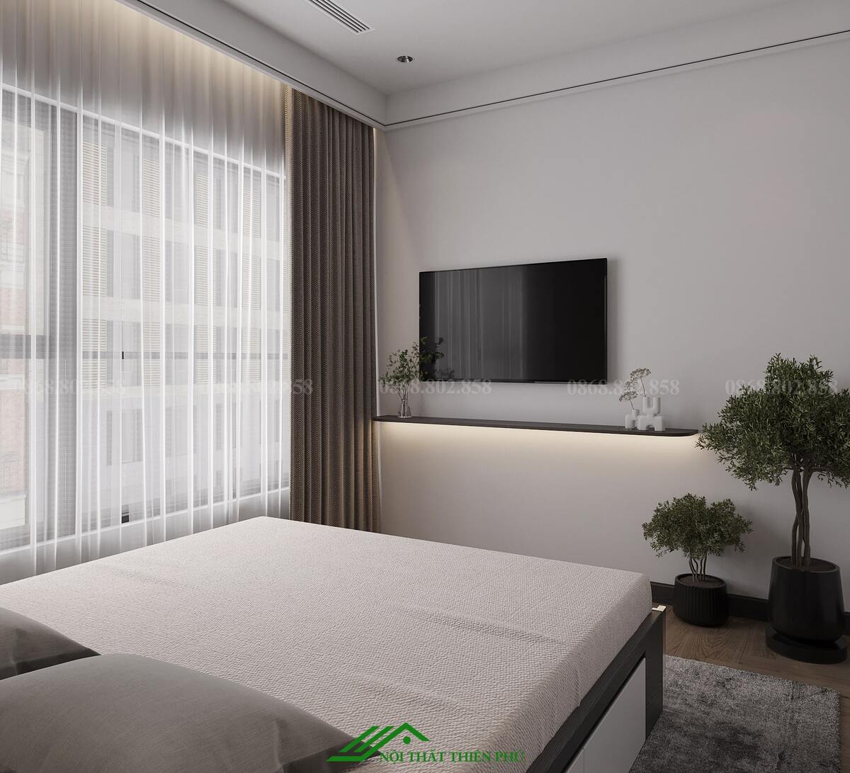 Tông màu chủ đạo: Phòng sử dụng tông màu trung tính như trắng, be và xám, kết hợp với các điểm nhấn màu gỗ tự nhiên để tạo cảm giác ấm cúng và hài hòa. Ánh sáng tự nhiên được tận dụng tối đa nhờ cửa sổ lớn với rèm cửa 2 lớp, mang lại không gian thoáng đãng và tràn đầy sức sống.