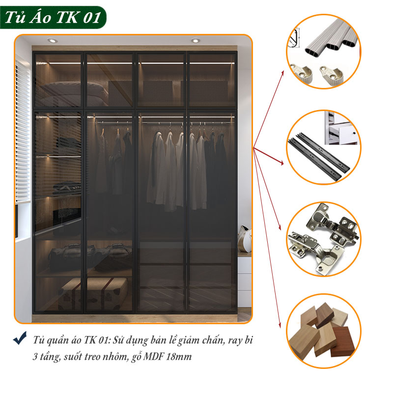 Mô tả chi tiết sản phẩm: Tủ Áo 4 Cánh Kính - TK 01