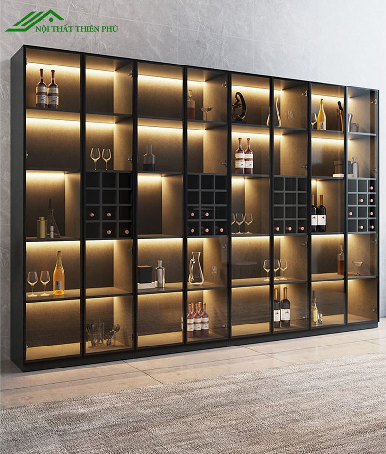 - Hiệu Ứng Ánh Sáng: Đèn LED hiện đại không chỉ làm nổi bật các chai rượu mà còn tạo không gian trưng bày đẳng cấp, sang trọng.