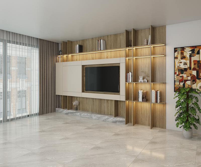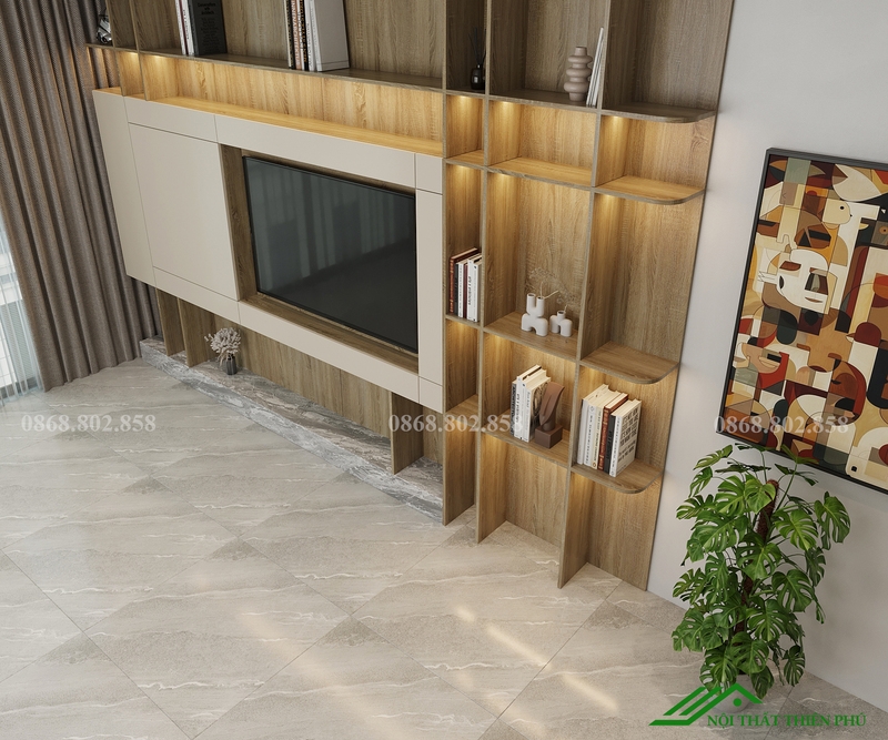 Bên cạnh vai trò trang trí, tủ kệ tivi TT 15 còn đáp ứng tốt nhu cầu lưu trữ. Các khoang tủ kín giúp cất gọn thiết bị điện tử, phụ kiện, đồ dùng sinh hoạt, giữ cho khu vực phòng khách luôn gọn gàng và ngăn nắp. Cách kết hợp giữa kệ mở và tủ kín giúp gia chủ dễ dàng phân chia đồ dùng theo mục đích sử dụng, vừa tiện lợi vừa đảm bảo tính thẩm mỹ.