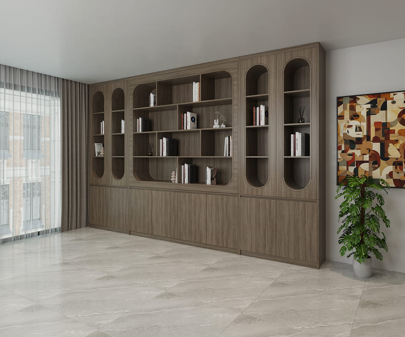 Không chỉ dừng lại ở yếu tố thẩm mỹ, tủ kệ trang trí TT 18 còn ghi điểm nhờ tính ứng dụng cao. Hệ kệ được thiết kế khoa học với nhiều không gian lưu trữ và trưng bày khác nhau, cho phép gia chủ sắp xếp sách, đồ trang trí, vật lưu niệm hay các chi tiết decor một cách gọn gàng, có chủ ý. Mỗi ngăn kệ không chỉ là nơi đặt đồ mà còn là điểm nhấn góp phần định hình phong cách cho toàn bộ căn phòng.