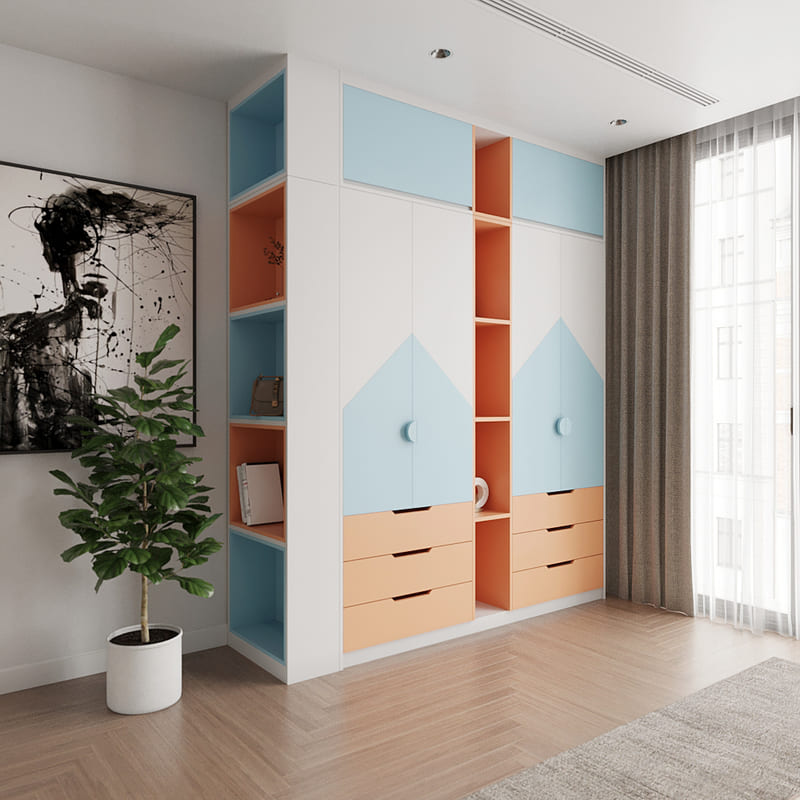 Ưu điểm tiếp theo đến từ kệ trang trí tích hợp. Đây là điểm khác biệt nổi bật so với các mẫu tủ truyền thống. Gia chủ có thể trưng bày sách, túi xách, khung ảnh, đồ lưu niệm hay những vật dụng trang trí nhỏ, vừa tiện lợi vừa tạo điểm nhấn thẩm mỹ cho không gian phòng ngủ. Nhờ vậy, chiếc tủ không chỉ đóng vai trò lưu trữ mà còn góp phần làm đẹp, mang lại sự sinh động và hiện đại cho căn phòng.