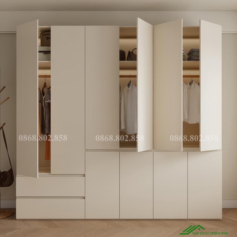 Thiết kế hiện đại, linh hoạt và đa năng là điểm cộng tiếp theo của mẫu tủ này. QA 77 sở hữu kiểu dáng đơn giản, các mảng khối phẳng và đường nét vuông vức, phù hợp với xu hướng nội thất tối giản đang rất được ưa chuộng hiện nay. Các ngăn tủ được phân chia khoa học gồm khoang treo quần áo dài, ngăn gấp, ngăn kéo để đồ phụ kiện hoặc đồ lót, giúp người dùng dễ dàng phân loại và sắp xếp trang phục một cách ngăn nắp. Một số mẫu còn tích hợp gương soi, bàn trang điểm hoặc kệ trưng bày, tăng tiện ích mà không cần thêm quá nhiều món đồ nội thất khác.