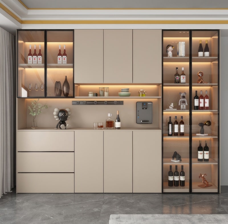 Cuối cùng, tính năng lưu trữ thông minh chính là yếu tố làm nên sự tiện lợi của TR 31. Ngoài các khoang trưng bày, tủ còn được tích hợp các ngăn kéo hoặc kệ kín ở phần chân tủ, cho phép gia chủ dễ dàng cất giữ ly rượu, dụng cụ mở nắp, khăn lau hoặc những vật dụng liên quan một cách gọn gàng, kín đáo nhưng luôn sẵn sàng khi cần sử dụng.